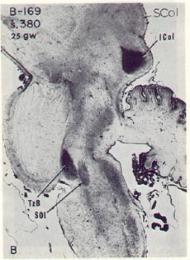 Figure 6 - From Yakovlev & Lecours (1967) showing prominent myelination in the inferior colliculus (ICOL) at 25 gestational weeks (below) and 29 gestational weeks (right).