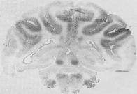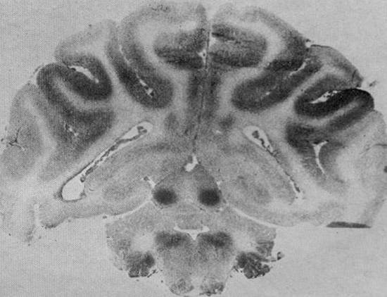 Figure xx - Autoradiograph showing blood flow in the brain of a newborn monkey. The greatest blood flow is to the inferior colliculi in the midbrain. High blood flow is also seen in other subcortical structures and inner sulci of the cerebral cortex (with permission from the American Medical Association).