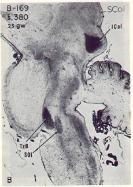 Two views of early myelin formation in the inferior coliculus (IC) of the human fetus: Left at 25, below at 29 gestational weeks.