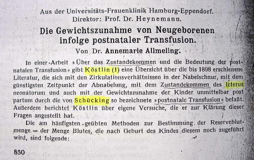 | Allmeling (1930) measured weight gain in 100 infants during the period of postnatal transfusion. She also cited and summarized several research articles that predated hers by more than 50 years (Kostlin 1898), Hofmeier 1878). Her work was cited and later confirmed by Gunther (1957). |