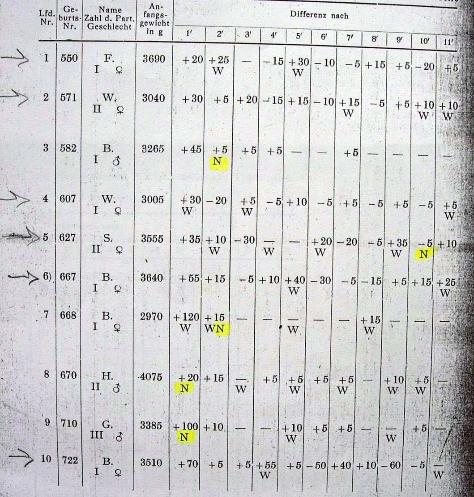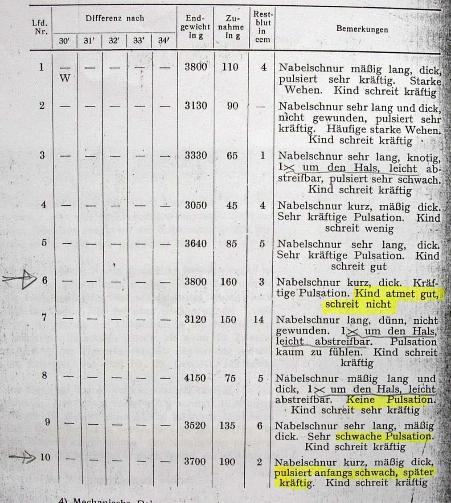 | To accommodate the 34-minute time span of the table it was presented in three sections, which are reproduced below. Most important perhaps is illustration of the variable time span for continuing pulsation of the cord (Nabelschnur), designated by N (and highlighted by me). The W designates Wehe (uterine contractions), showing their association with additional gains in weight, which diminish after pulsations of the cord cease - pulsations of the cord, from the infant heart, are the primary signal for continuing need of placental circulation. |