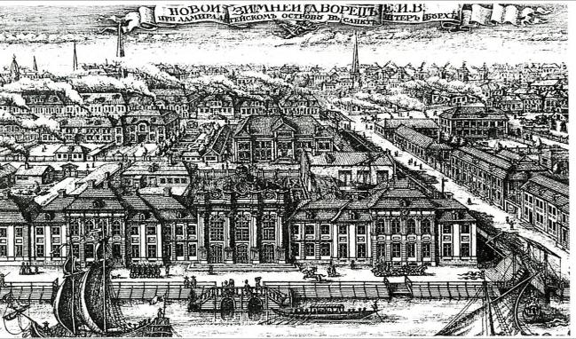 St. Petersburg Winter Palace as it looked in 1725. Note the windmills in