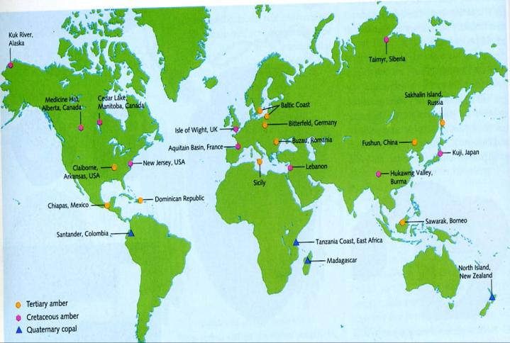| Map showing areas around the world where we find amber. Red dots mark places like Medicine Hat, Alberta, Canada, New Jersey, the Isle of Wight UK, Lebanon, and Kuji, Japan where people unearth amber formed during the cretaceous period, some 120 million years ago. |