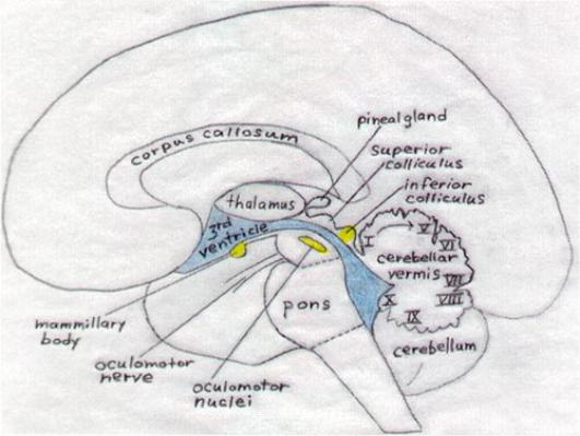 Figure 9 - Diagram showing brainstem sites affected in Wernicke's encephalopathy
